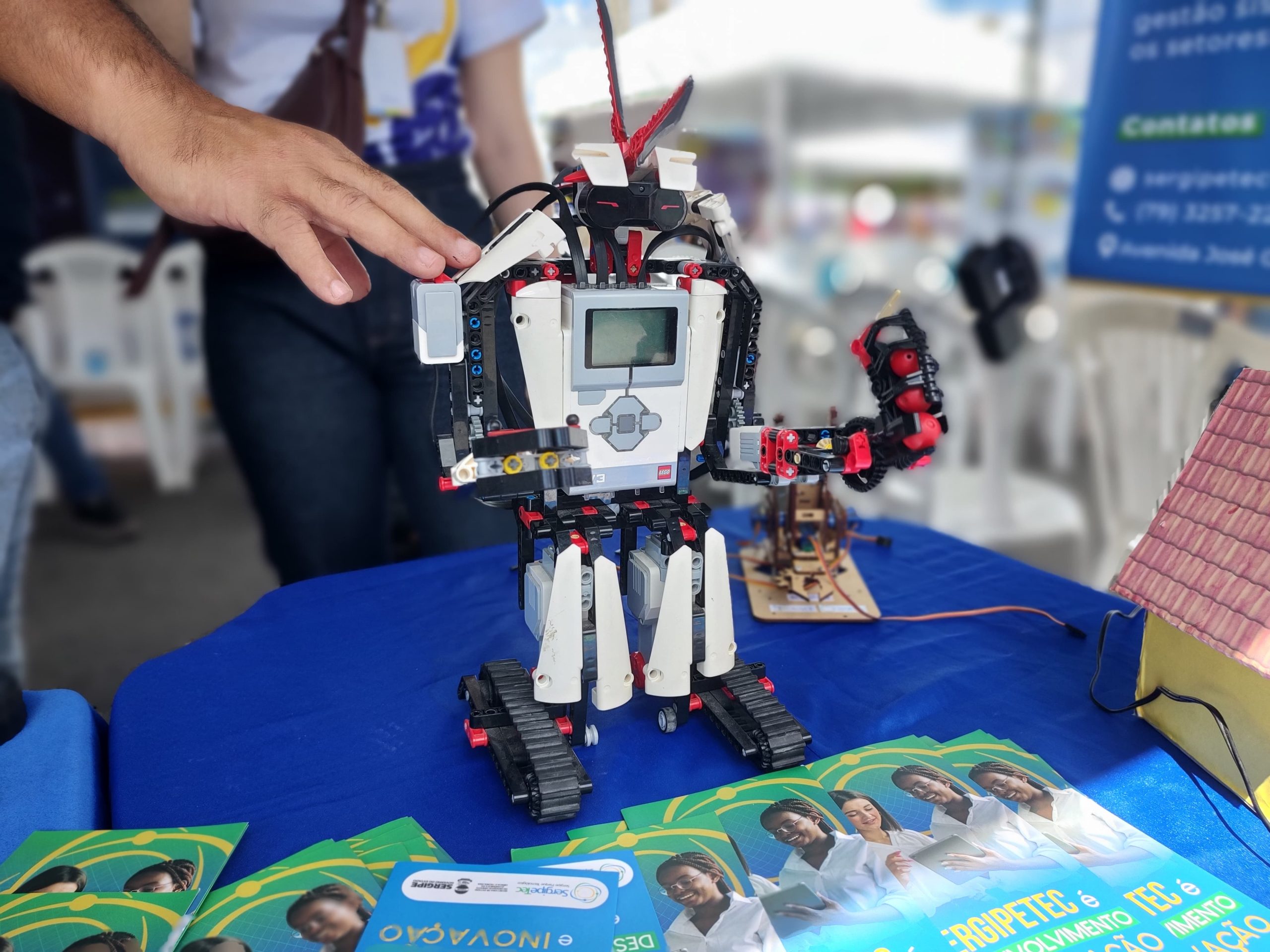 O Sergipe Parque Tecnológico (SergipeTec) apresentou seus projetos na área de robótica e forneceu informações sobre inovação e desenvolvimento tecnológico para a comunidade local. “Nós trouxemos projetos voltados para a iniciativa dos jovens na área de desenvolvimento. Temos aqui o projeto do carrinho via controle remoto, o braço robótico, um robô que faz movimentos e a casa com sensor de presença, onde ele simula uma proteção para a residência”, detalhou o professor do SergipeTec, José Sérgio.